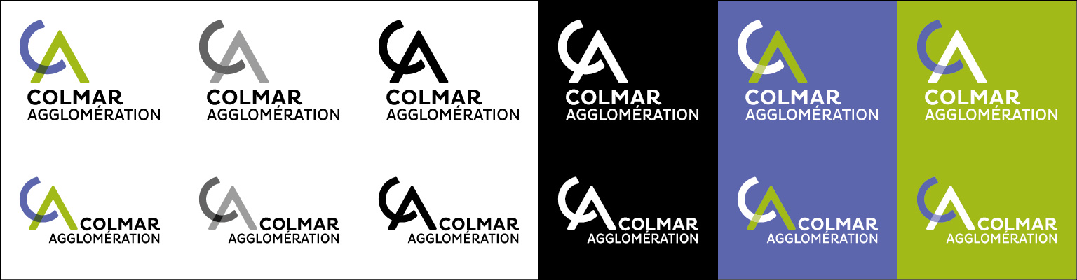 Le logo de Colmar Agglomération existe en 2 versions ("verticale" et "horizontale") et est décliné en différents modes colorimétriques : couleur, niveau de gris, noir, sur fond noir, sur fond bleu et sur fond vert.